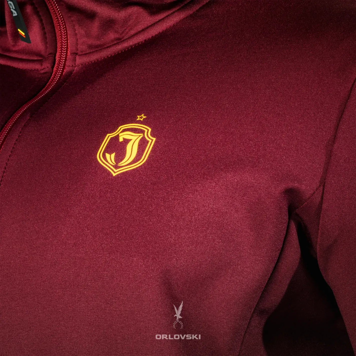 - Na plecach stylizowany herb w formie pionowego symbolu