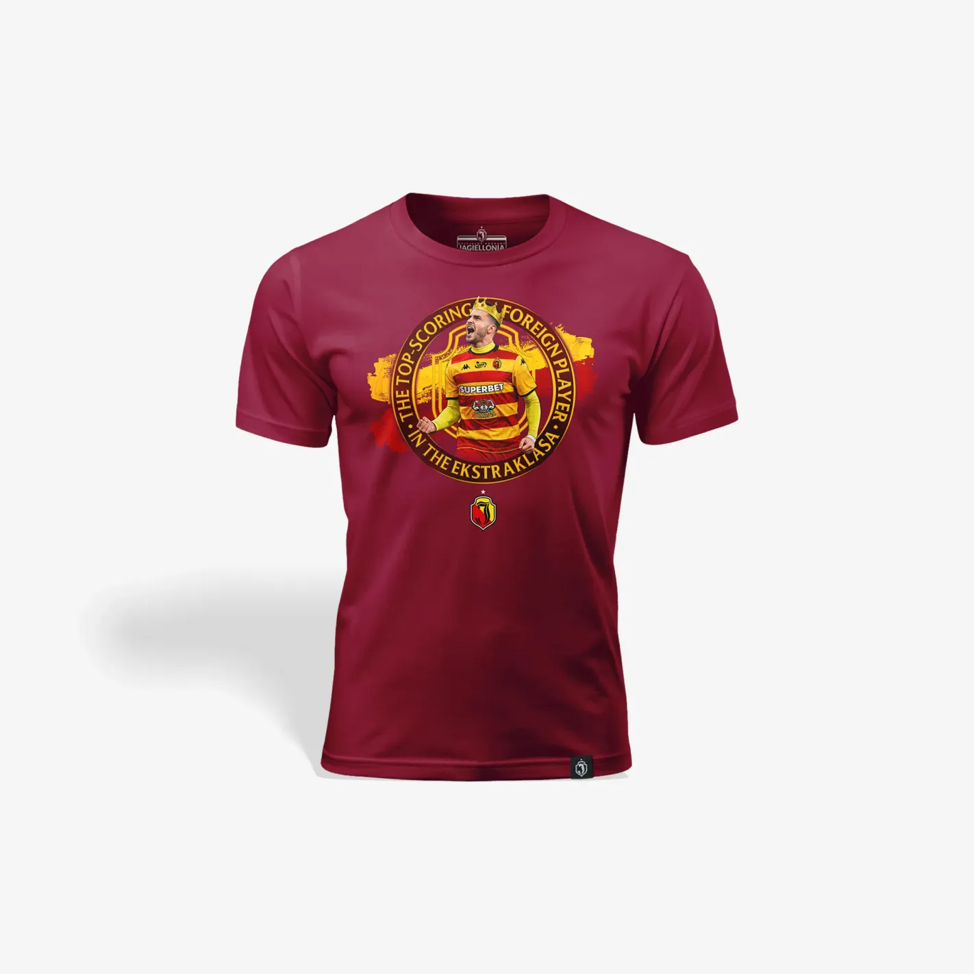 Przedstawiamy bordową koszulkę sportową poświęconą hiszpańskiemu piłkarzowi Jesúsowi Imazowi. Zaprojektowana jako edycja specjalna, upamiętniająca historyczne osiągnięcie Jesúsa Imaza w Ekstraklasie