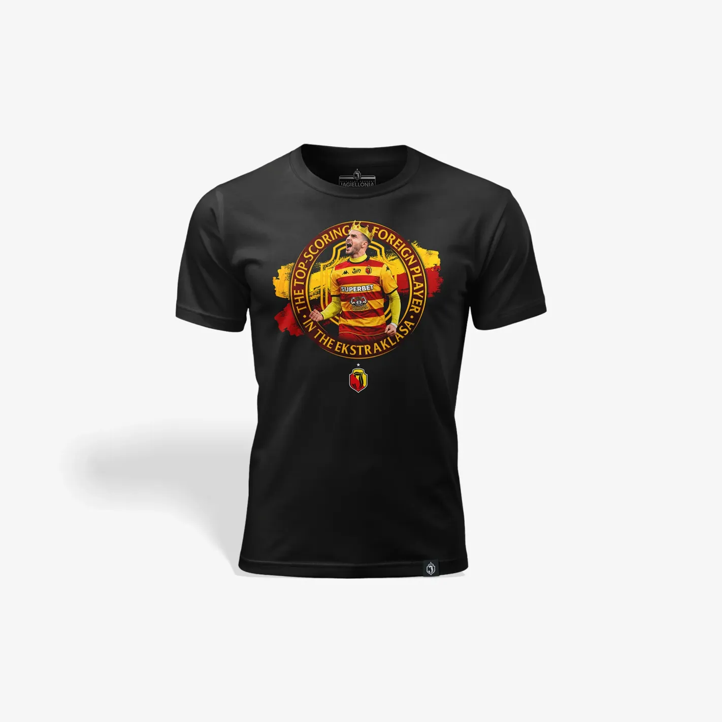 Przedstawiamy czarną koszulkę sportową poświęconą hiszpańskiemu piłkarzowi Jesúsowi Imazowi. Zaprojektowana jako edycja specjalna, upamiętniająca historyczne osiągnięcie Jesúsa Imaza w Ekstraklasie