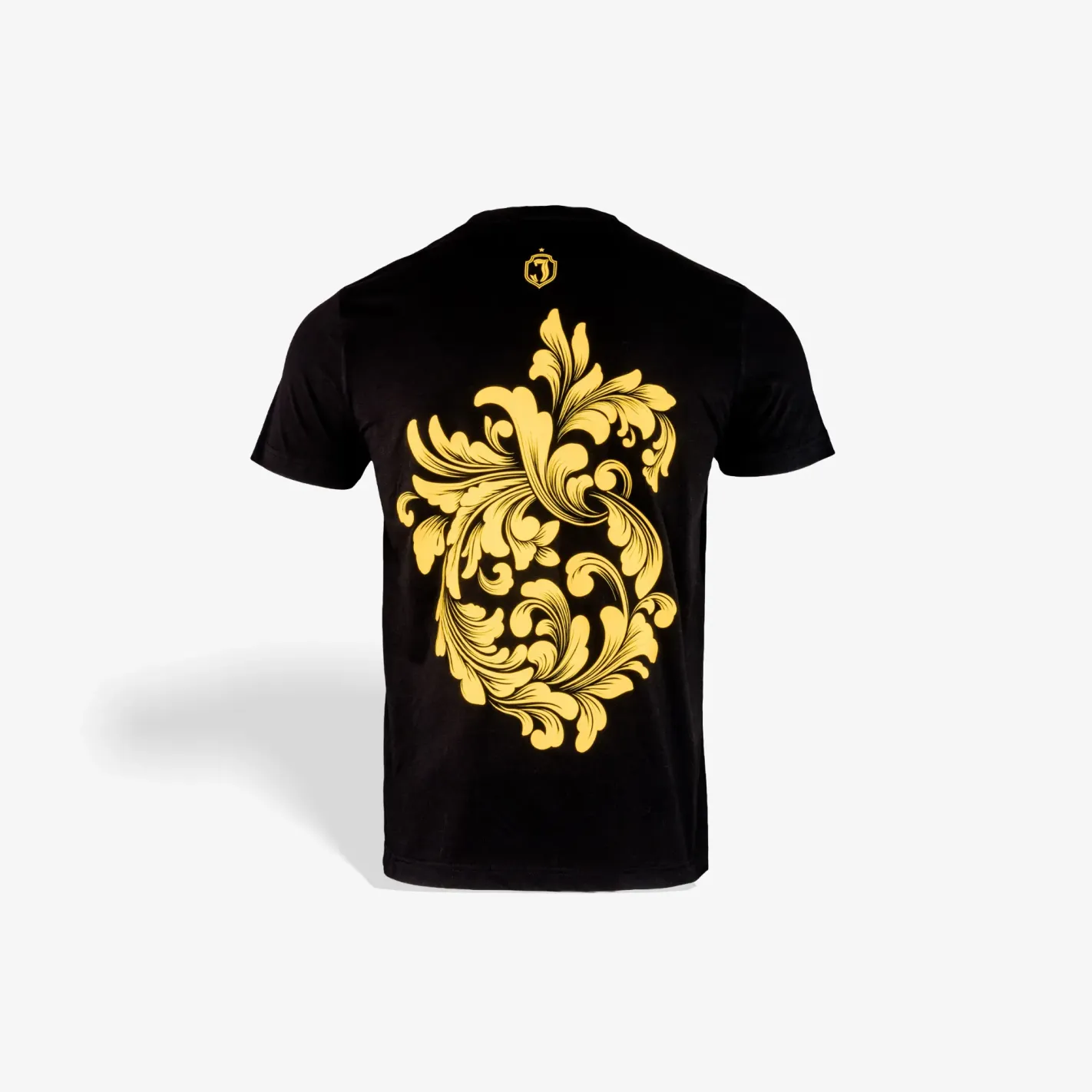 Wyjątkowa koszulka dla osób ceniących styl, elegancję i detale. Czarny t-shirt ozdobiony efektywnym złotym ornamentem na plecach, który nadaje całości luksusowego charakteru i przyciąga wzrok.