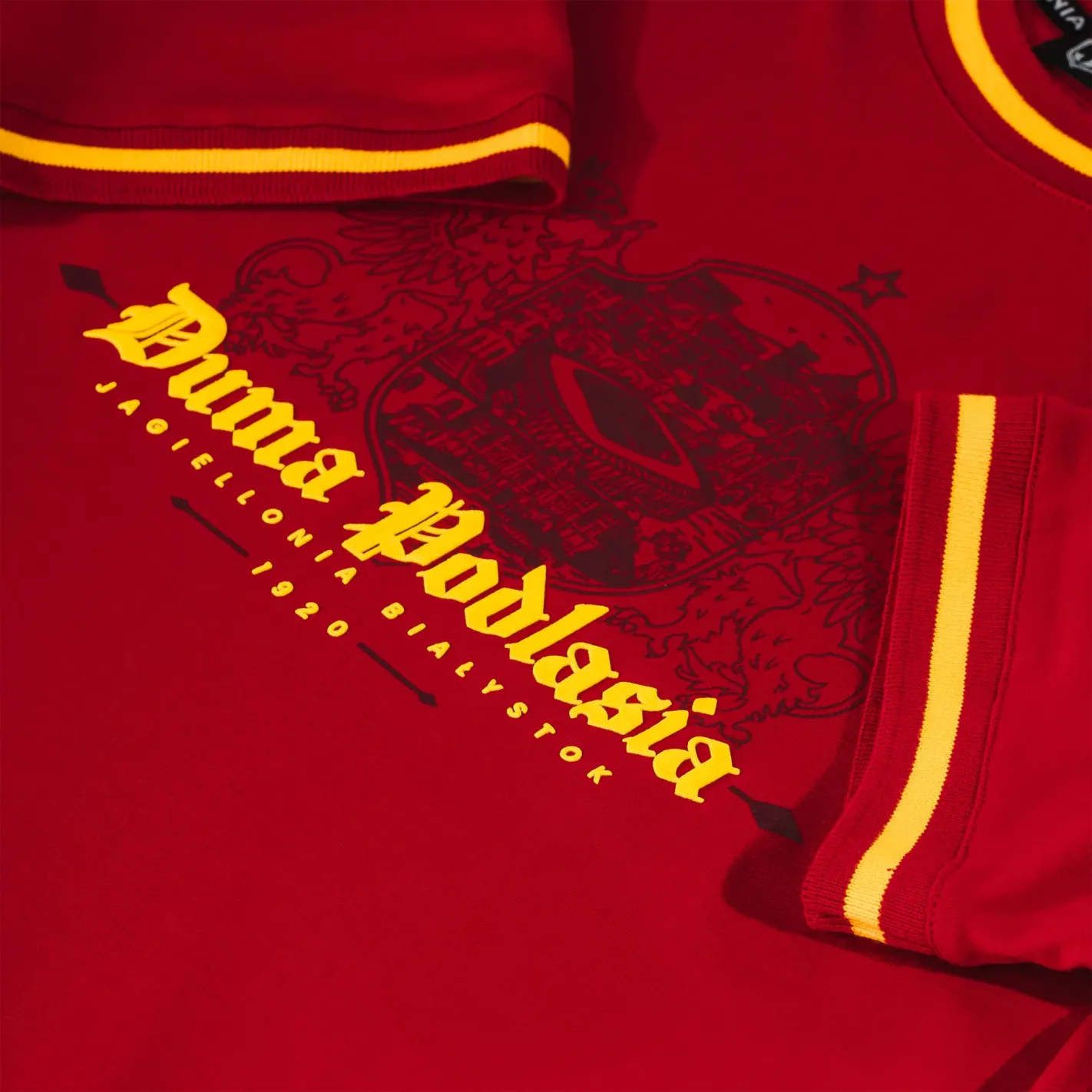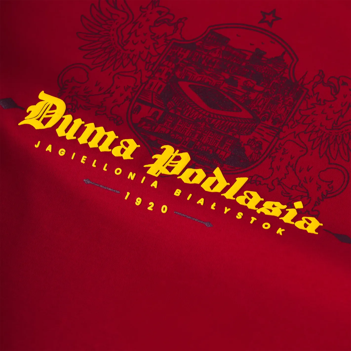 - Wypukły napis „Duma Podlasia” – unikalny nadruk wykonany techniką PUFF o szerokości 30 cm, nadający grafice efektowną, trójwymiarową strukturę