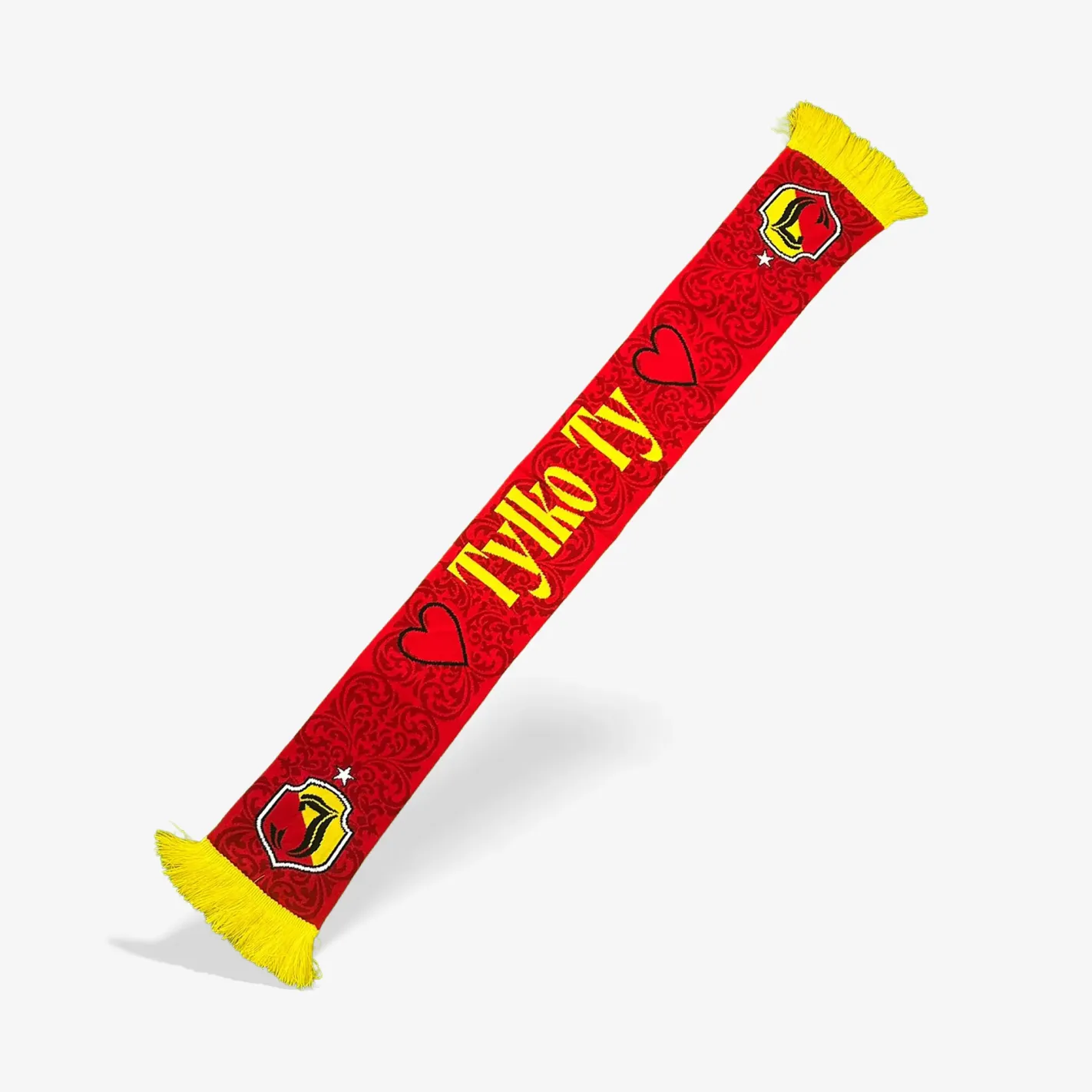 Ten wyjątkowy szalik to połączenie kibicowskiej tradycji z eleganckim wykończeniem. Wykonany w głębokiej czerwieni, posiada subtelny, wzór z motywem ornamentu, który nadaje mu unikalnego charakteru