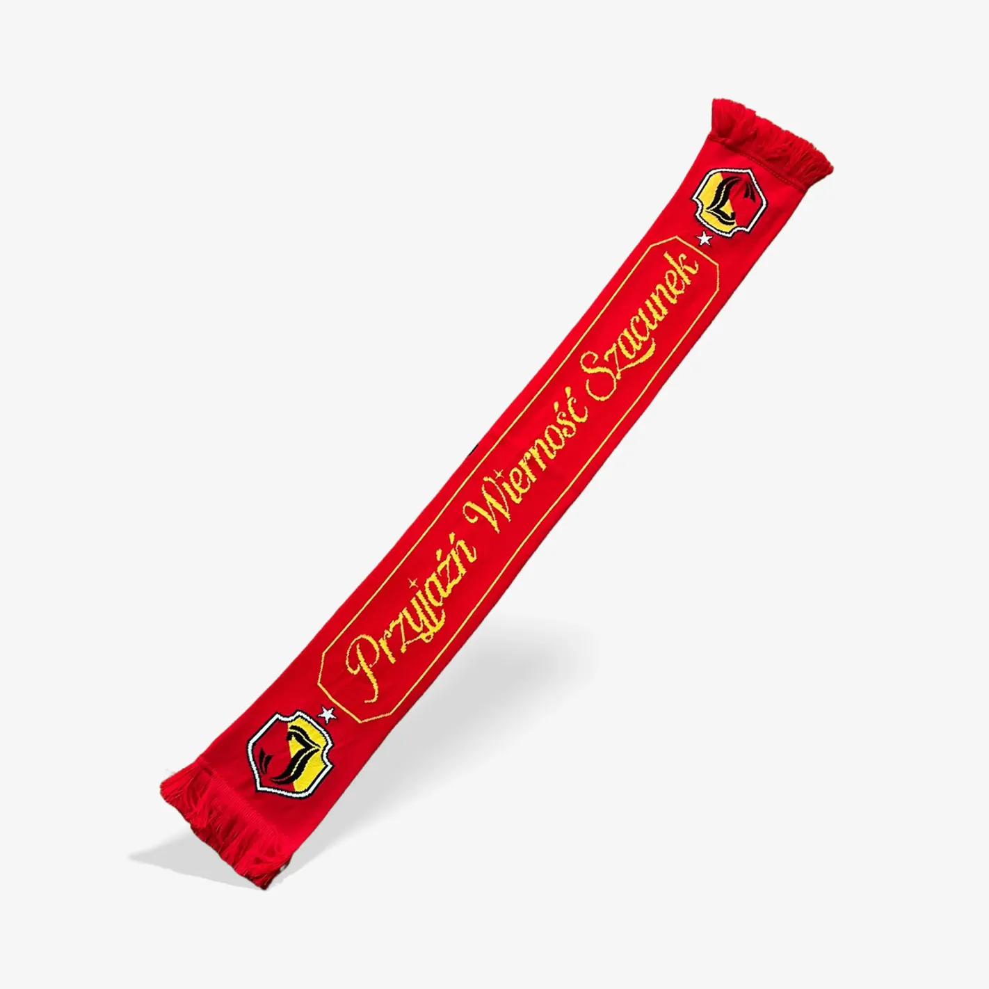 - Szalik zakończony jest klasycznymi, czerwonymi frędzlami, które nadają mu autentyczny, kibicowski sznyt