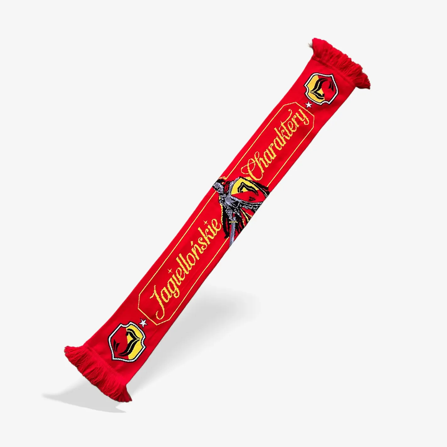 - Przez całą długość szalika ciągnie się żółty napis "Jagiellońskie Charaktery"